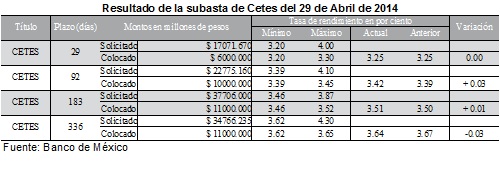 Agencia NotiLeón. 29/04/14.- La Secretaría de Hacienda y Crédito Público a través del Banco de México, en su carácter de agente financiero del gobierno federal, informó los resultados de la subasta de valores gubernamentales correspondientes a la semana: 18/14, los cuales se presentan a continuación: