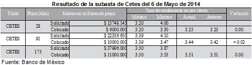 Agencia NotiLeón. 6/05/14.- La Secretaría de Hacienda y Crédito Público a través del Banco de México, en su carácter de agente financiero del gobierno federal, informó los resultados de la subasta de valores gubernamentales correspondientes a la semana: 19/14, los cuales se presentan a continuación: