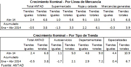 En Abril de 2014, el crecimiento nominal anual de las ventas de las Cadenas Asociadas a la ANTAD a unidades totales, incluyendo las aperturas, fue de 6.8%, y a unidades iguales, sin incluir nuevas tiendas, de 2.4%. Se debe considerar que Abril 2014 fue favorecido por la celebración de la Semana Santa