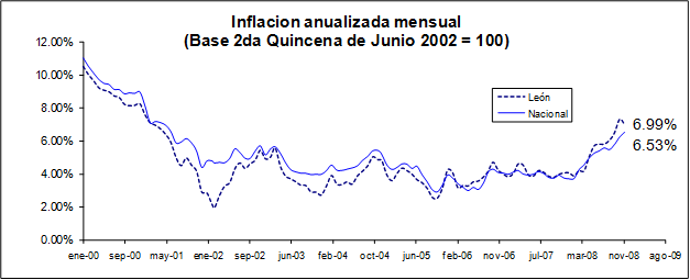 Así, la inflación de 6.99 por ciento que registró León en 2008 es la inflación anual más alta desde el año 2000, cuando la inflación fue de 8.25 por ciento.