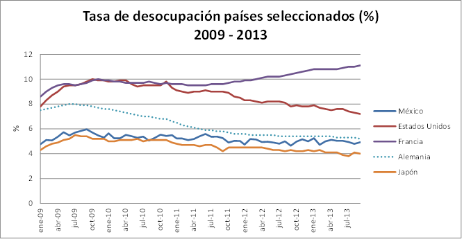 Agencia NotiLeón. 20/11/13.- Las estadísticas oficiales indican que México es uno de los países de la OCDE con menor tasa de desocupación. De acuerdo con información publicada por el INEGI, en los primeros nueve meses de este año el desempleo en México promedió 5.0%, mientras que en Estados Unidos fue de 7.5%, en Francia 10.9%, en Alemania 5.3% y en Japón 4.1%.