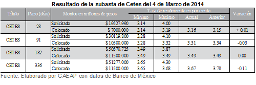 Agencia NotiLeón. 4/03/14.- La Secretaría de Hacienda y Crédito Público a través del Banco de México, en su carácter de agente financiero del gobierno federal, informó los resultados de la subasta de valores gubernamentales correspondientes a la semana: 10/14, los cuales se presentan a continuación: