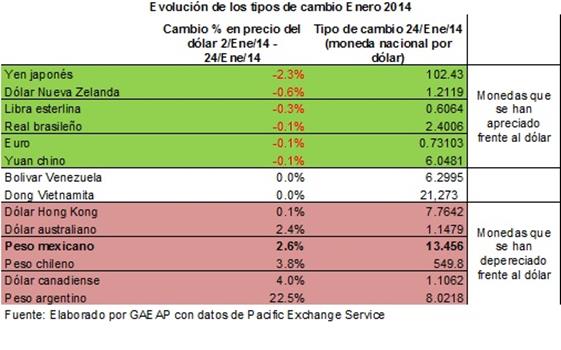A continuación se presenta una tabla elaborada por GAEAP en la que se aprecian las monedas que se han fortalecido y debilitado frente al dólar estadounidense en el periodo del 2 al 24 de enero de este año.